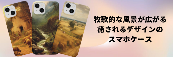 このスマホケースは、リアリズムのスタイルで描かれた広々とした田園風景が特徴です。青空に浮かぶ大きな雲と、のどかな道を歩く人々が自然の美しさと静けさをリアルに表現しています。